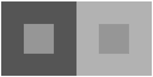 Even though the squares in the color have the same brightness, we interpret the one on the right as darker due to the differences in the surrounding lightness. Since the background of the square on the right is darker than the square, it appears lighter than when it is placed on a background lighter than the object.